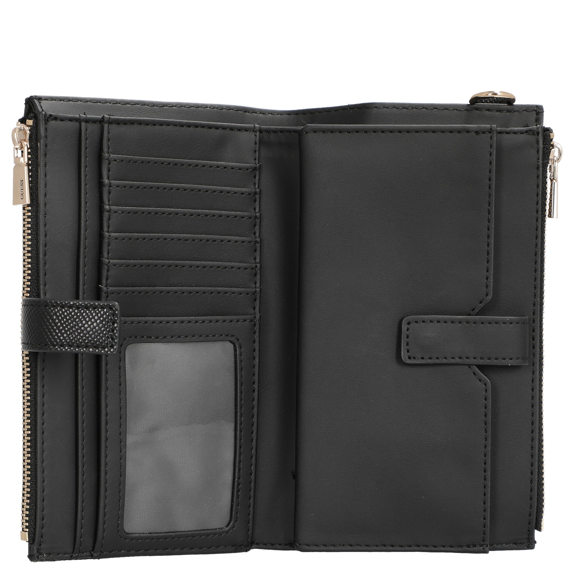 Diese schwarze Geldbörse von GUESS ist die perfekte Wahl für alle, die Wert auf elegantes Design und praktische Details legen.
