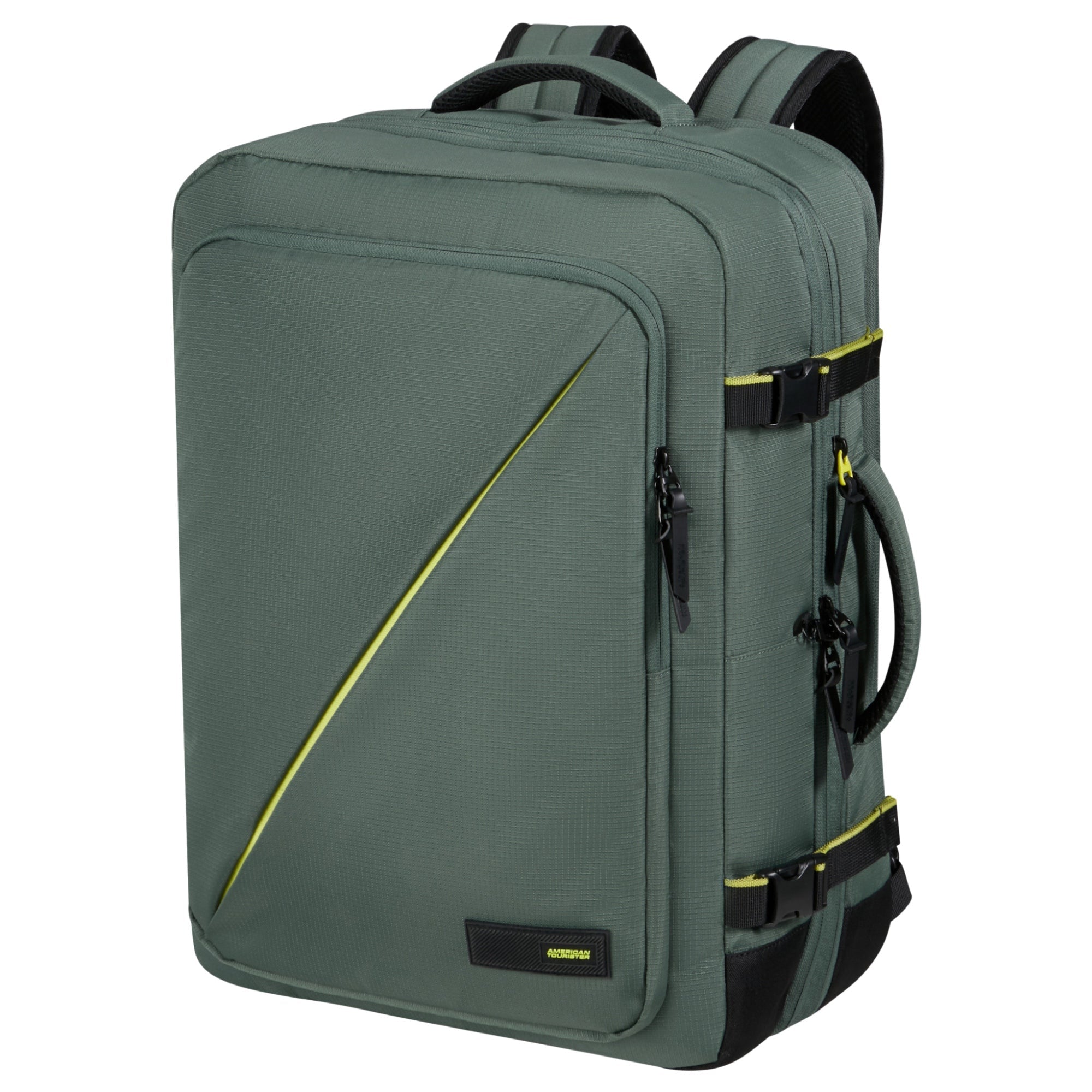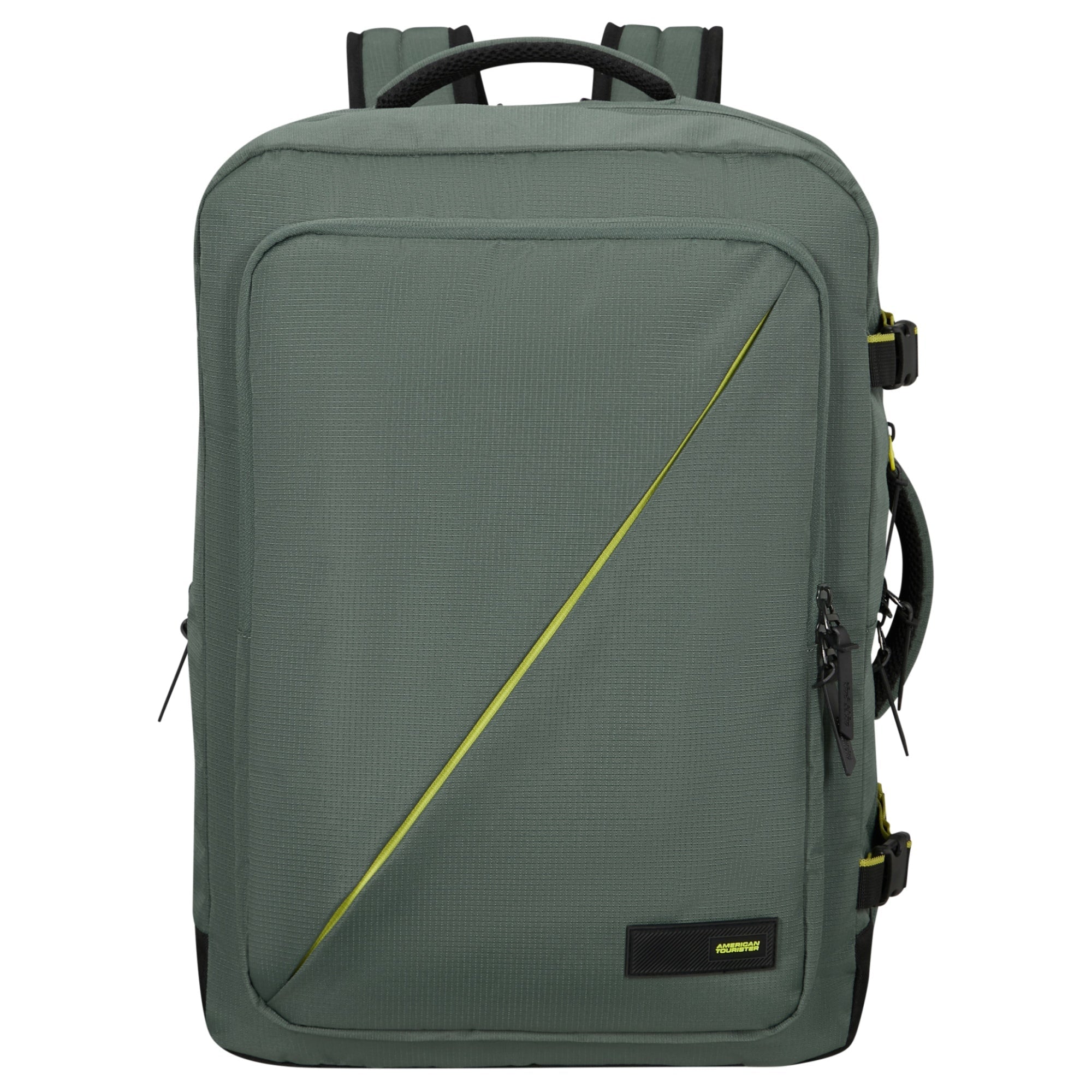 La mochila de viaje American Tourister Take2Cabin en verde combina un diseño robusto con una elección sostenible de materiales y es ideal para quienes buscan gran volumen y funcionalidad en el equipaje de mano.