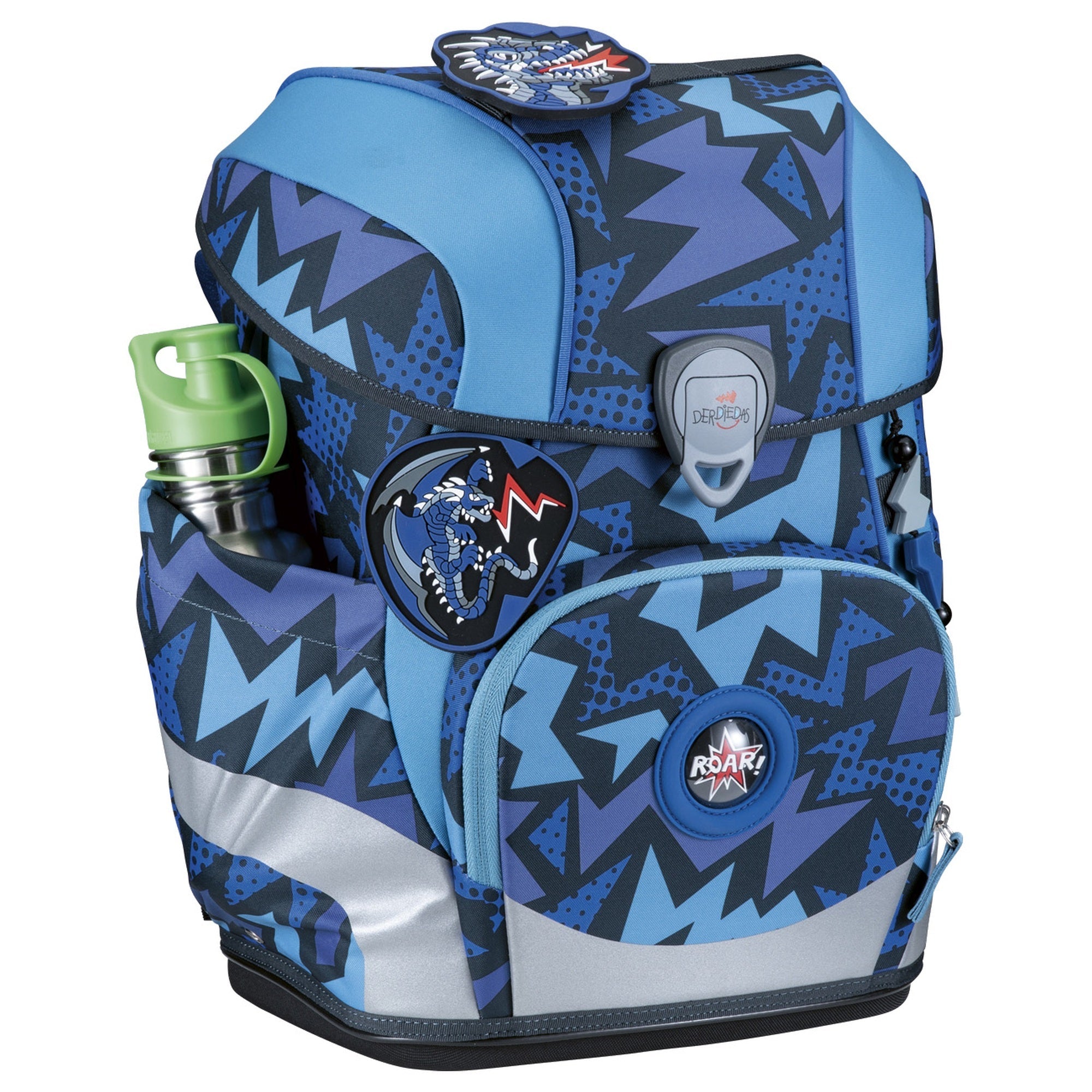 - Compartimentos prácticos: El espacioso bolsillo frontal es ideal para la fiambrera o el estuche escolar, mientras que los flexibles bolsillos laterales pueden usarse para la botella de agua o el paraguas.
