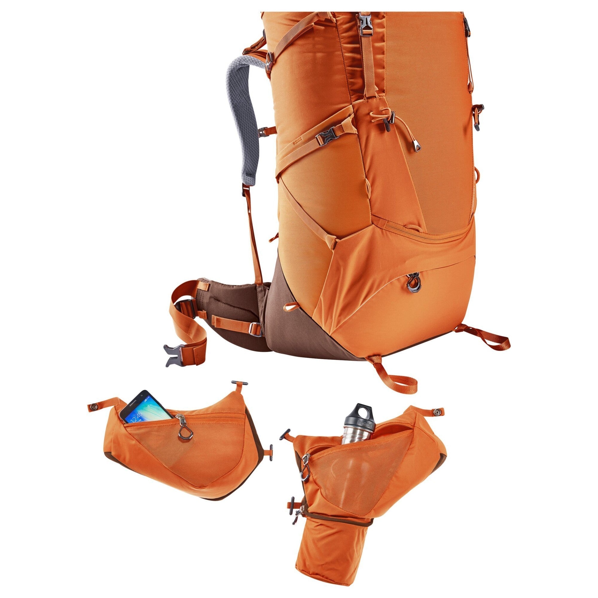 - Bolsillos con cremallera desmontables en las aletas de cadera, ideales para botellas de agua
