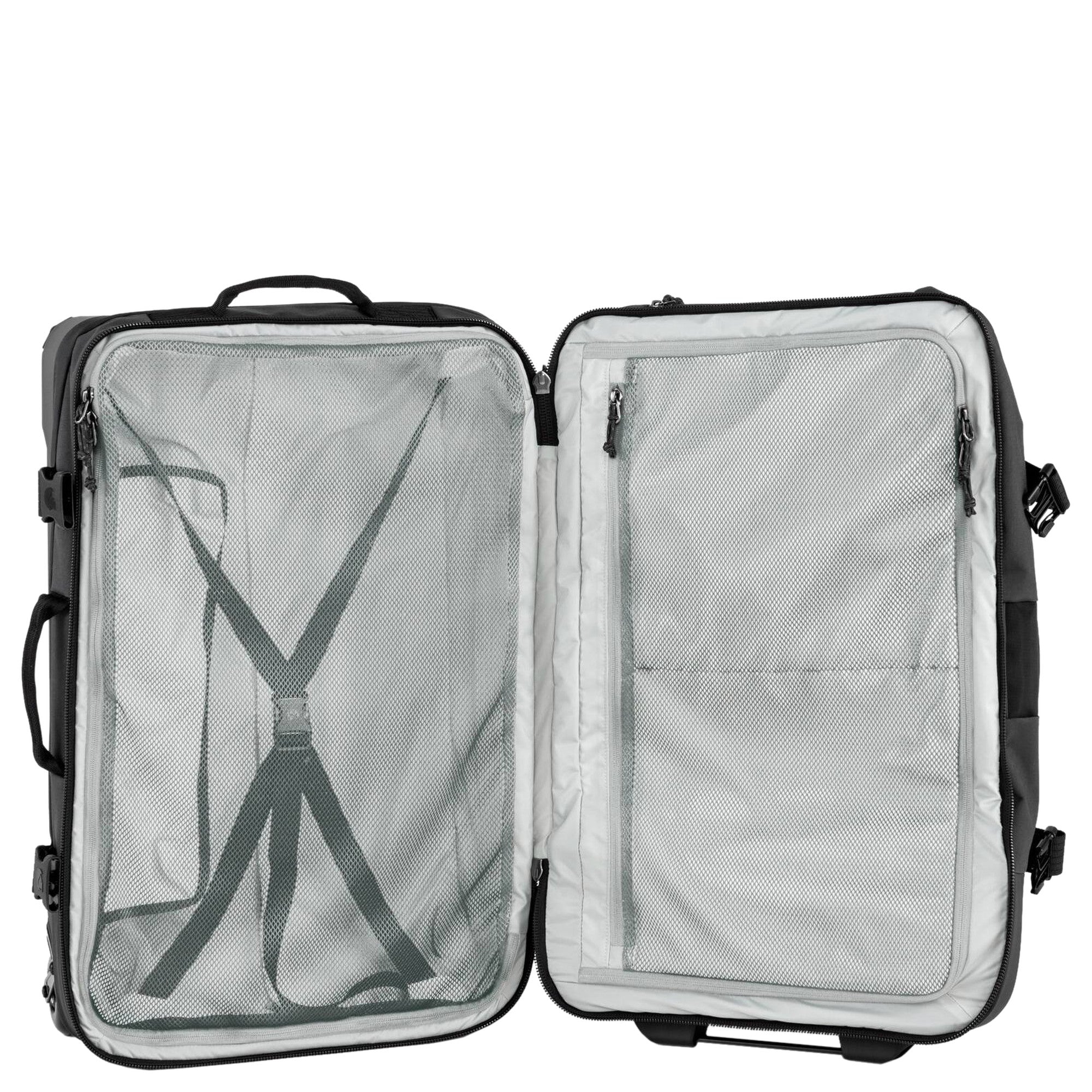 - Distribución interior – dos mitades con cintas de compresión y bolsillos de malla para una organización clara