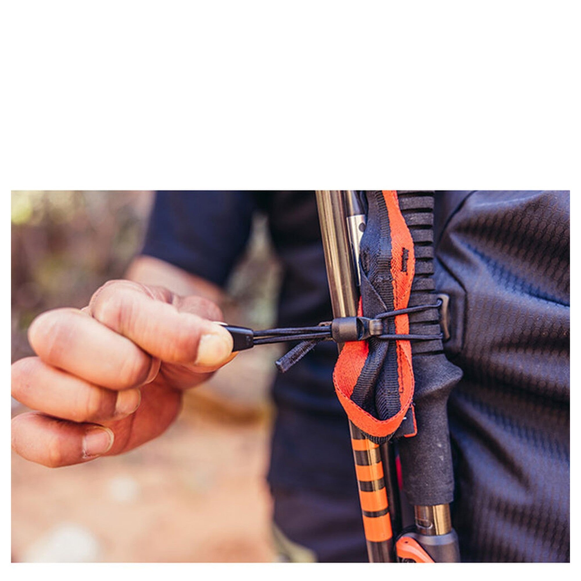 - Sistema de sujeción para bastones de trekking con cordón elástico ajustable