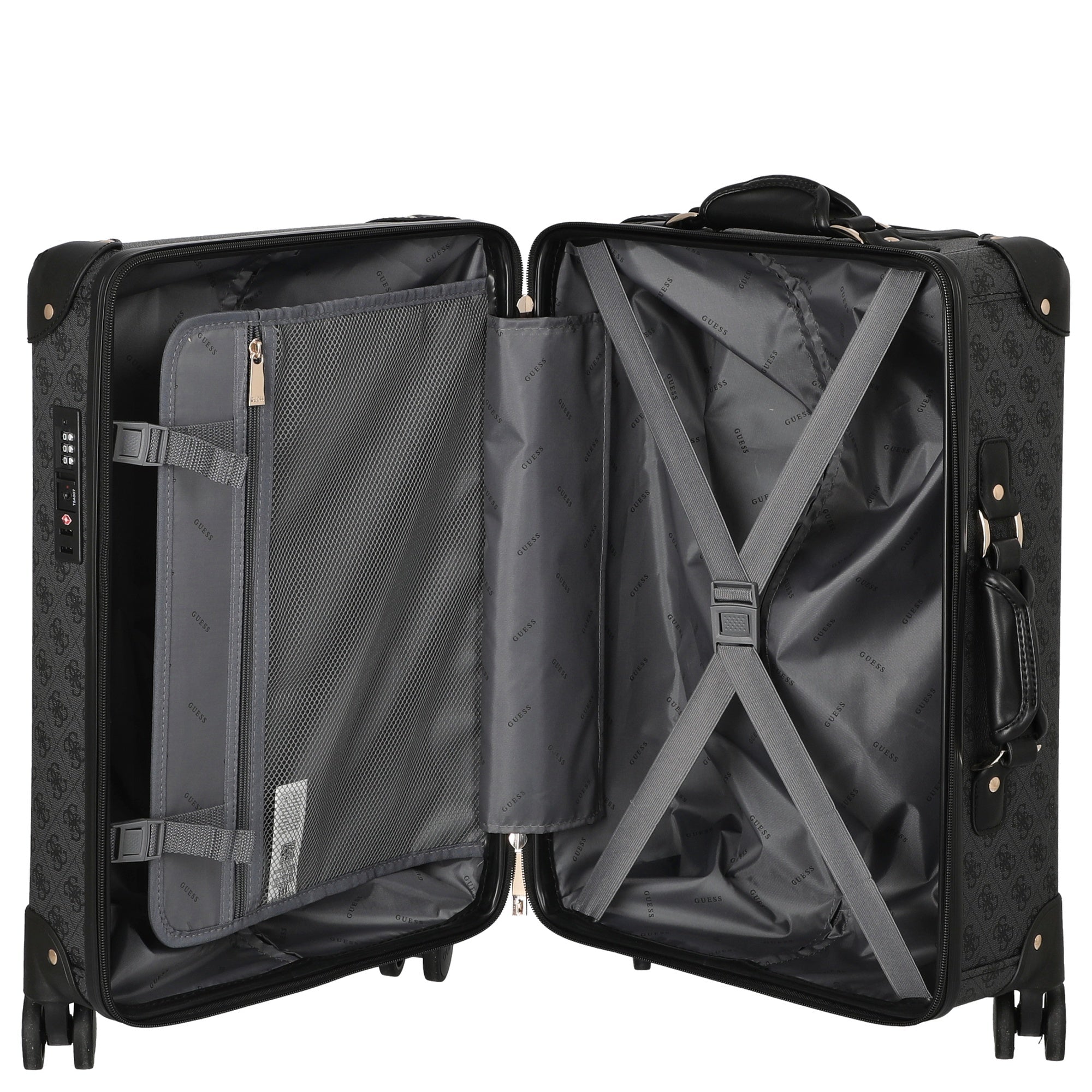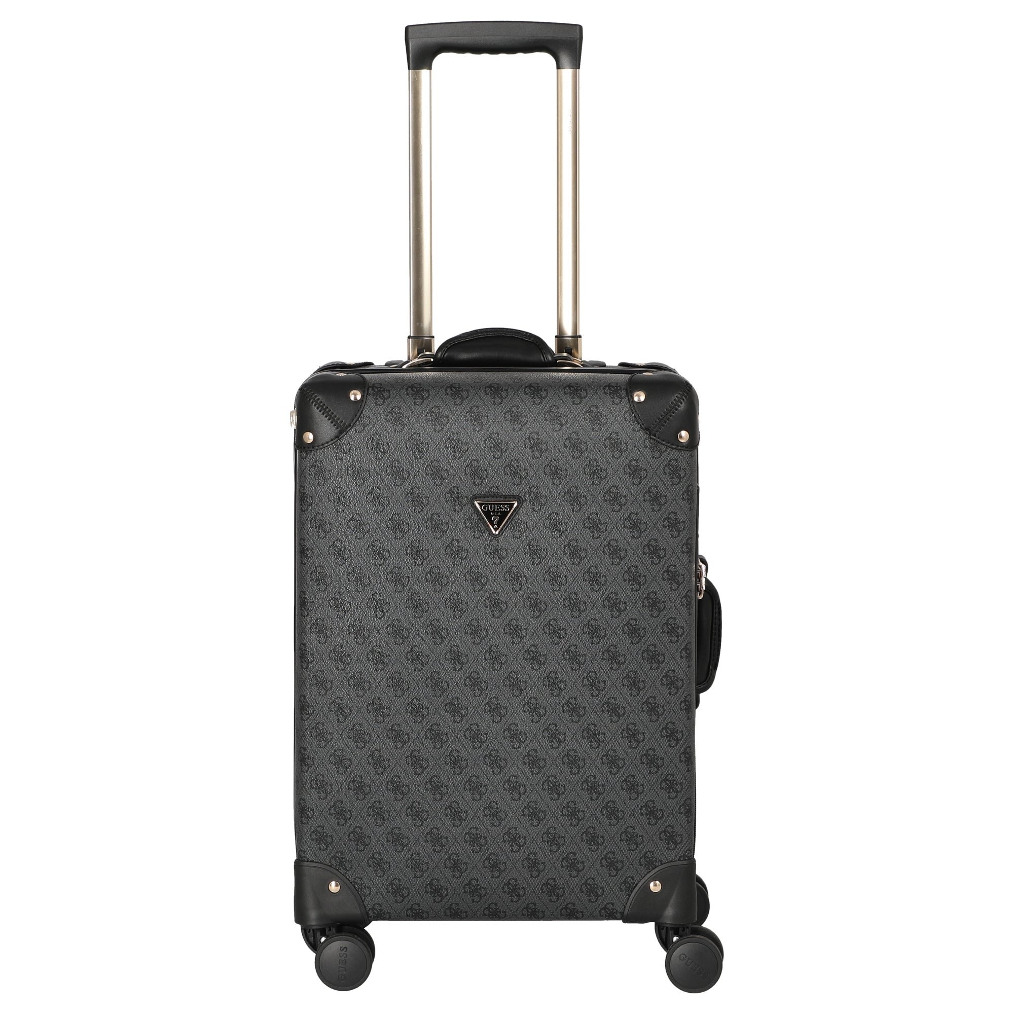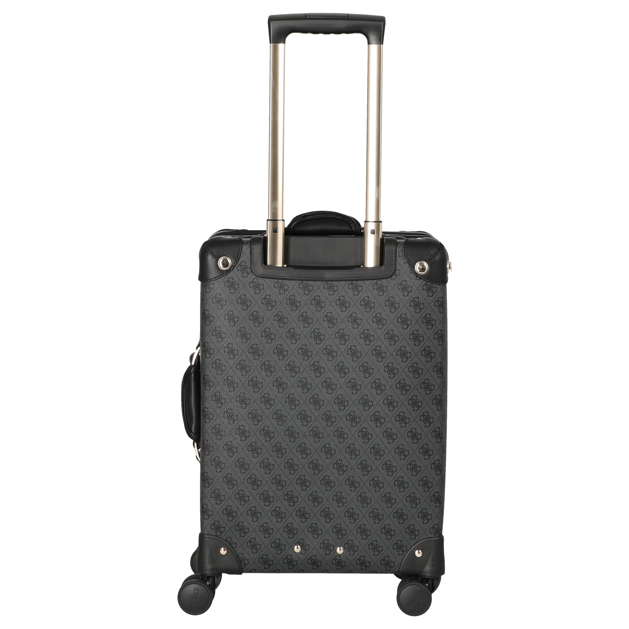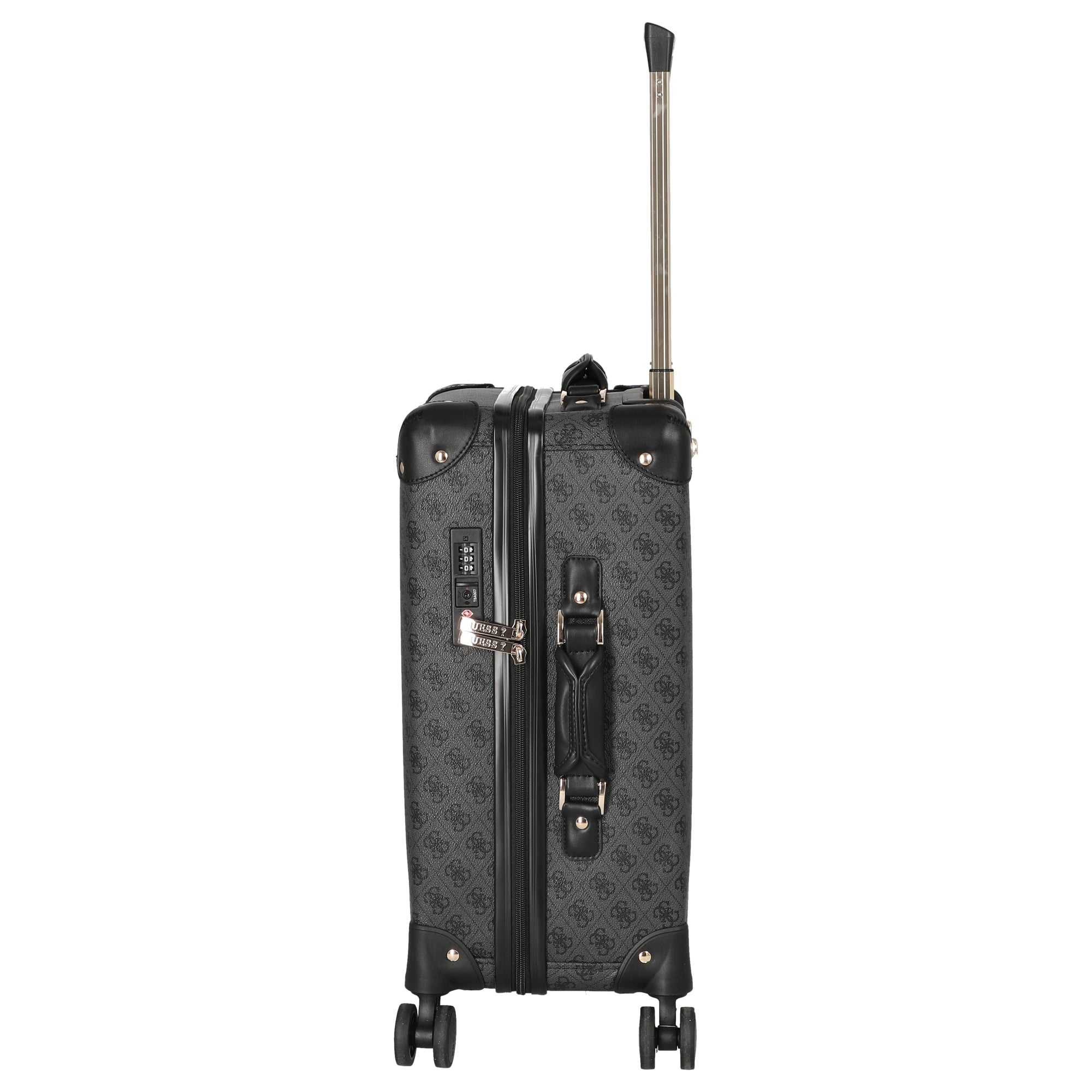 Ein robuster Kabinentrolley von GUESS in elegantem Coal-Logo-Design, der speziell für die Anforderungen moderner Reisender konzipiert wurde.