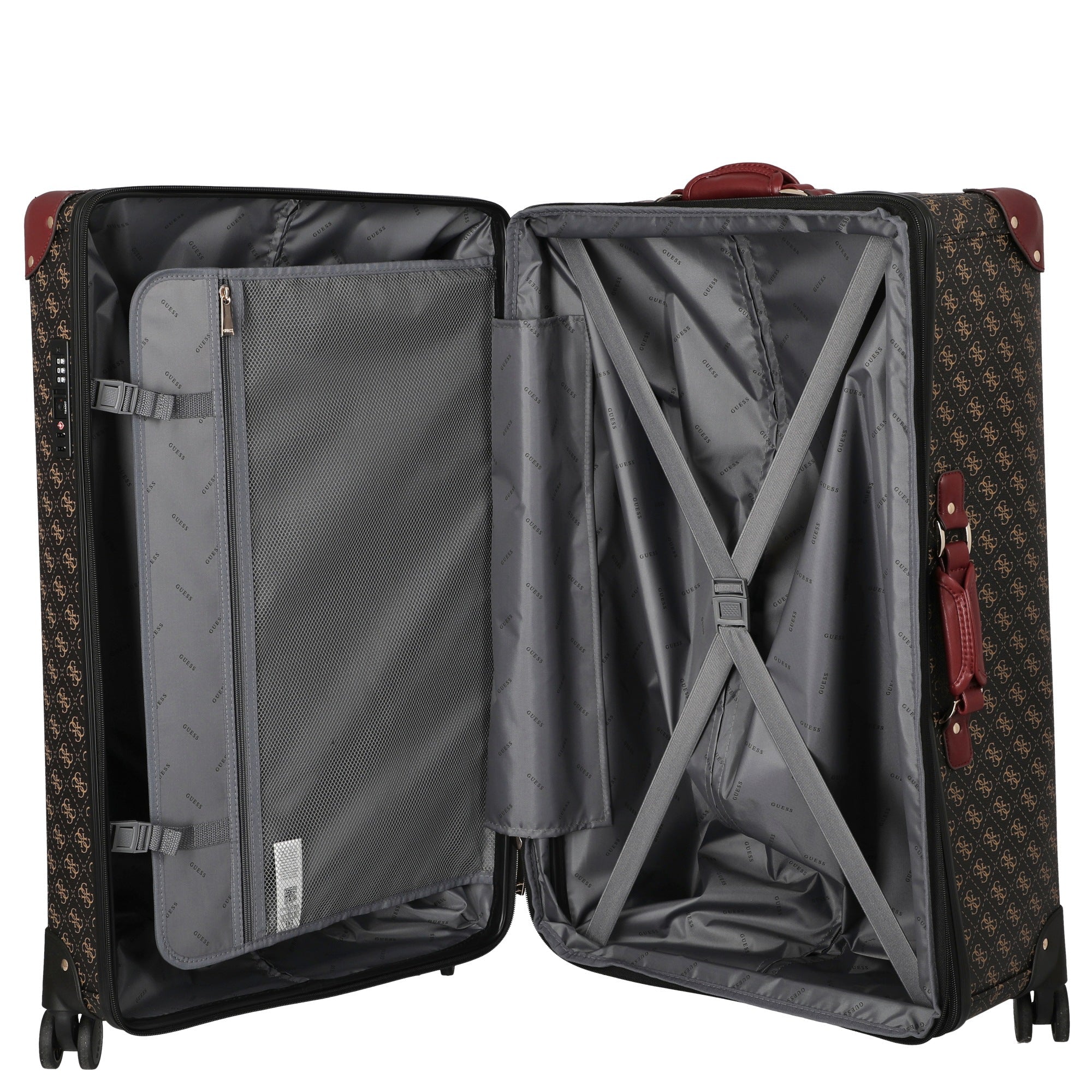 Dieser funktional gestaltete Trolley von GUESS kombiniert technische Details mit einem eleganten Design und eignet sich ideal für anspruchsvolle Reisende.