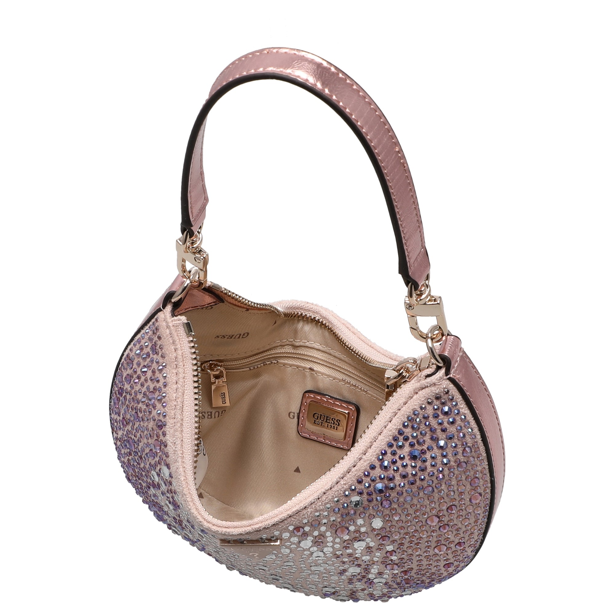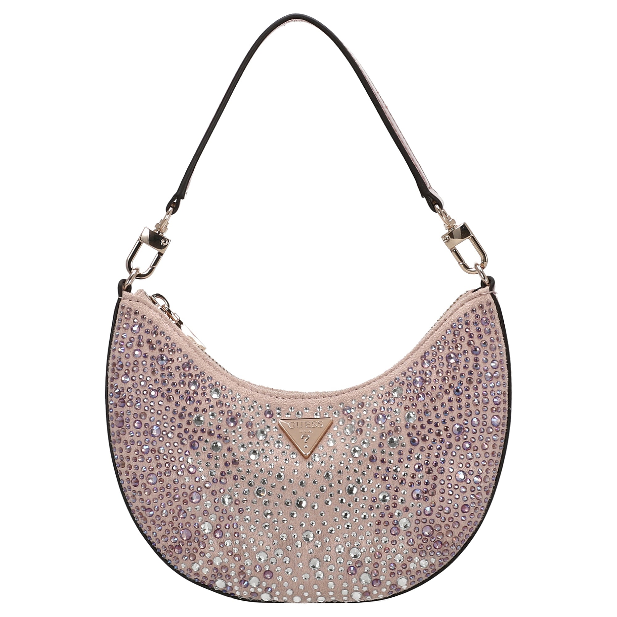 El bolso de hombro GUESS Tasmin Mini en delicado rosa claro es un acompañante elegante para mujeres con exigencias de moda que valoran la elegancia y la funcionalidad.