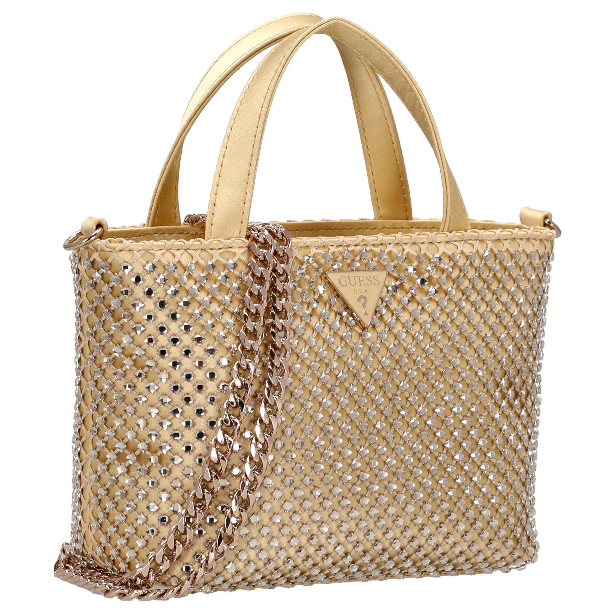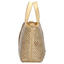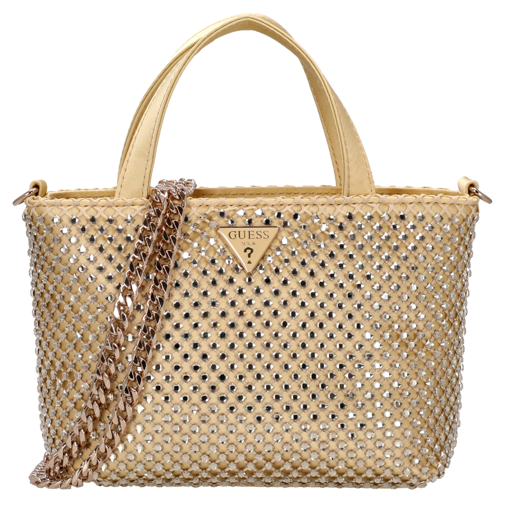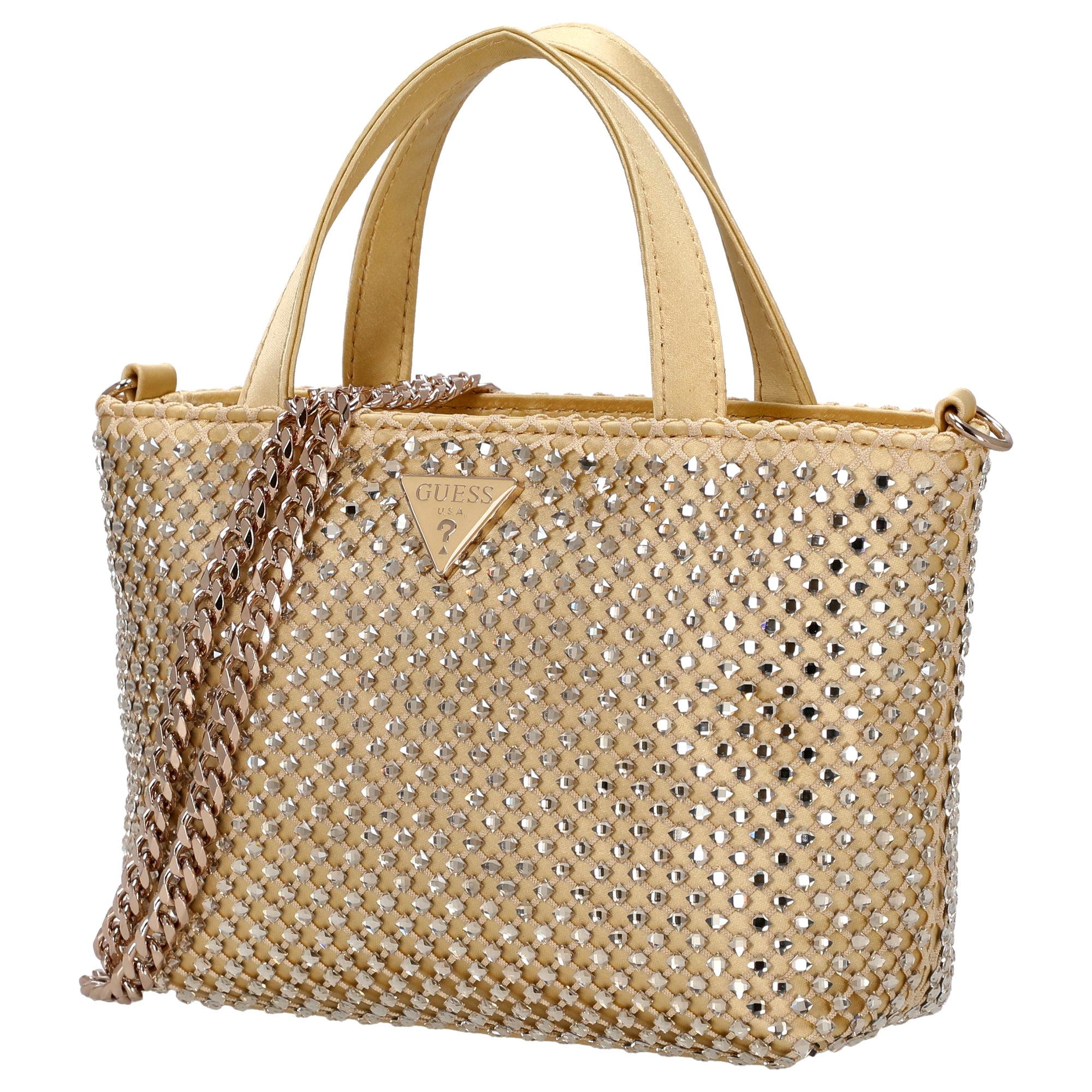 El bolso de mano Guess Tasmin Mini es un elegante bolso de asa en un brillante dorado, que aporta acentos de moda y es versátil para combinar.