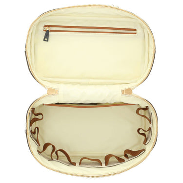 El Beautycase impresiona con un estampado de aciano atemporal sobre un fondo beige, que se acentúa de manera moderna con rayas de bloque contrastantes en la parte frontal. Los detalles metálicos en color dorado y el logo metálico JOOP! en la parte delantera le dan un toque lujoso al accesorio.