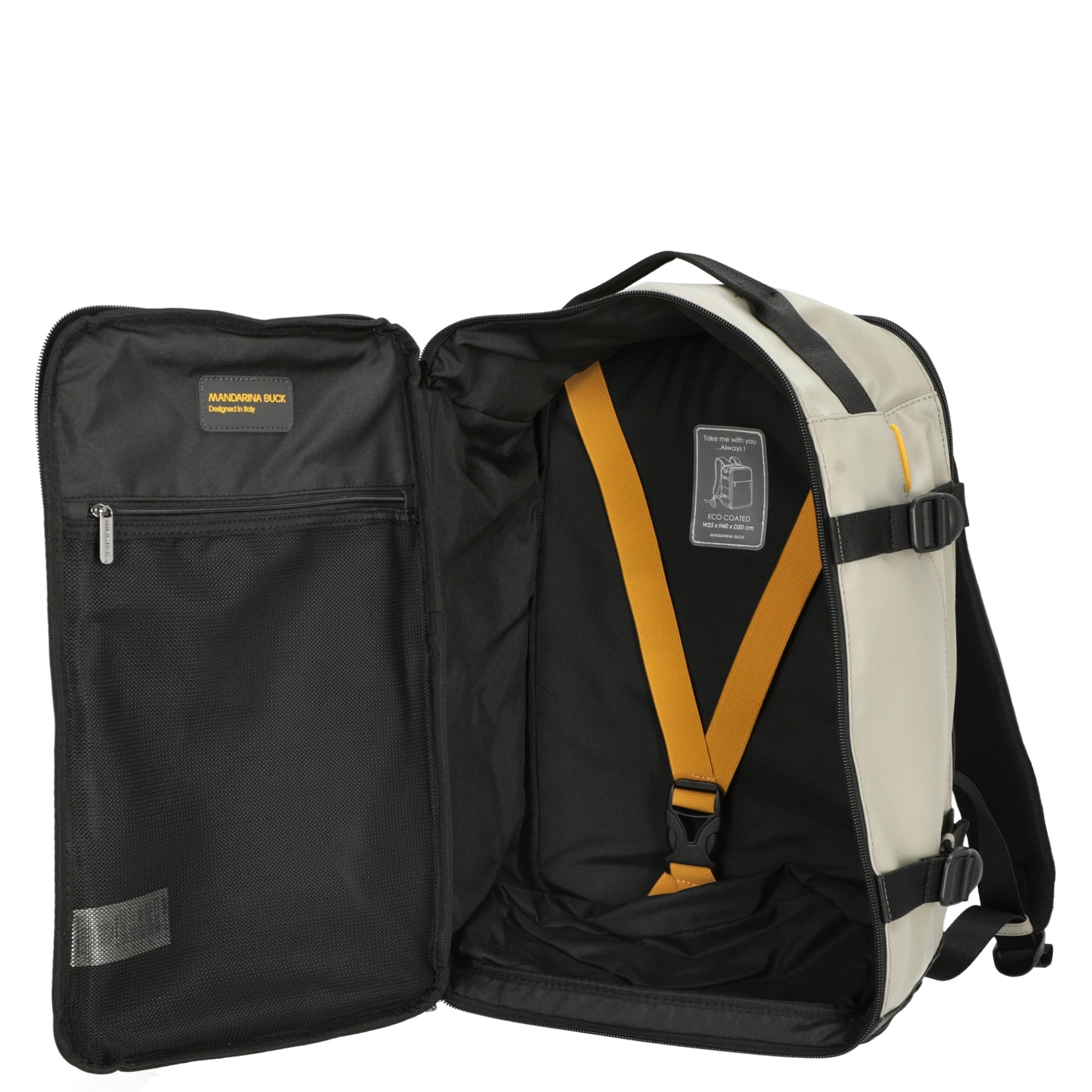 Descubra la mochila de viaje Mandarina Duck Eco Coated S en un vibrante amarillo pato. Esta mochila elegante combina funcionalidad con un diseño moderno y es el compañero perfecto para sus viajes o el día a día.