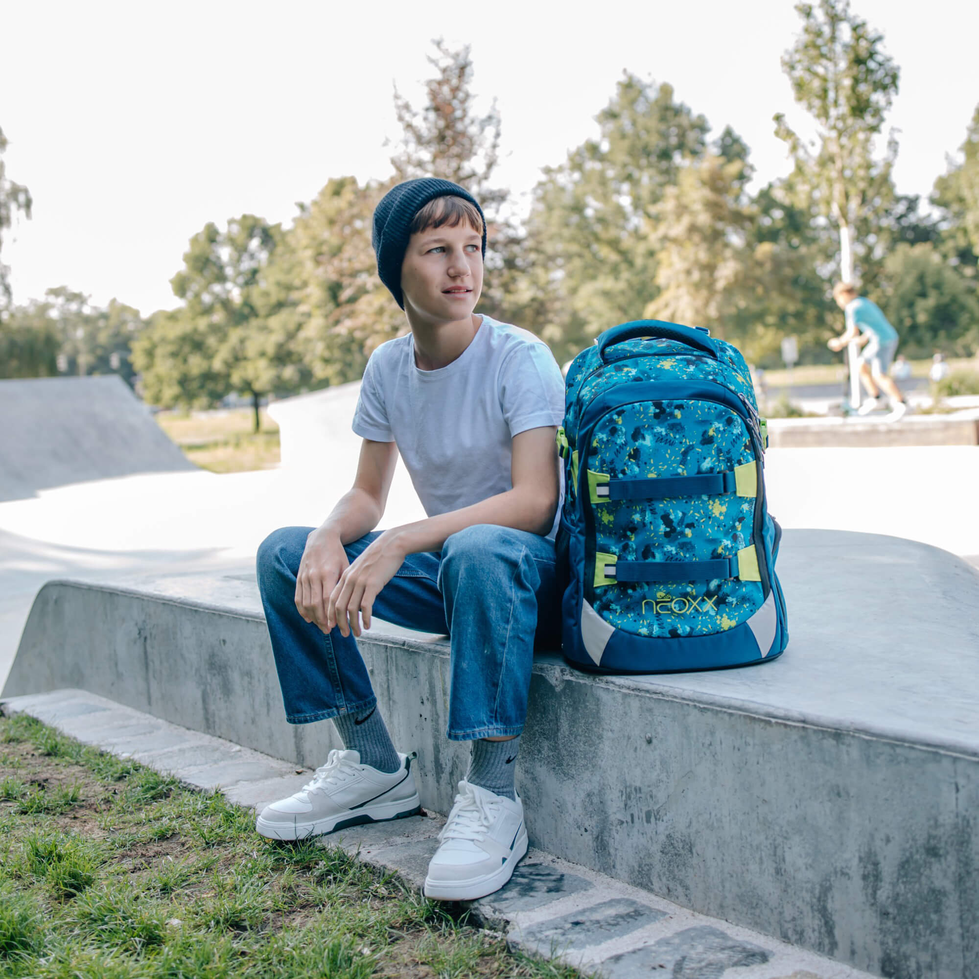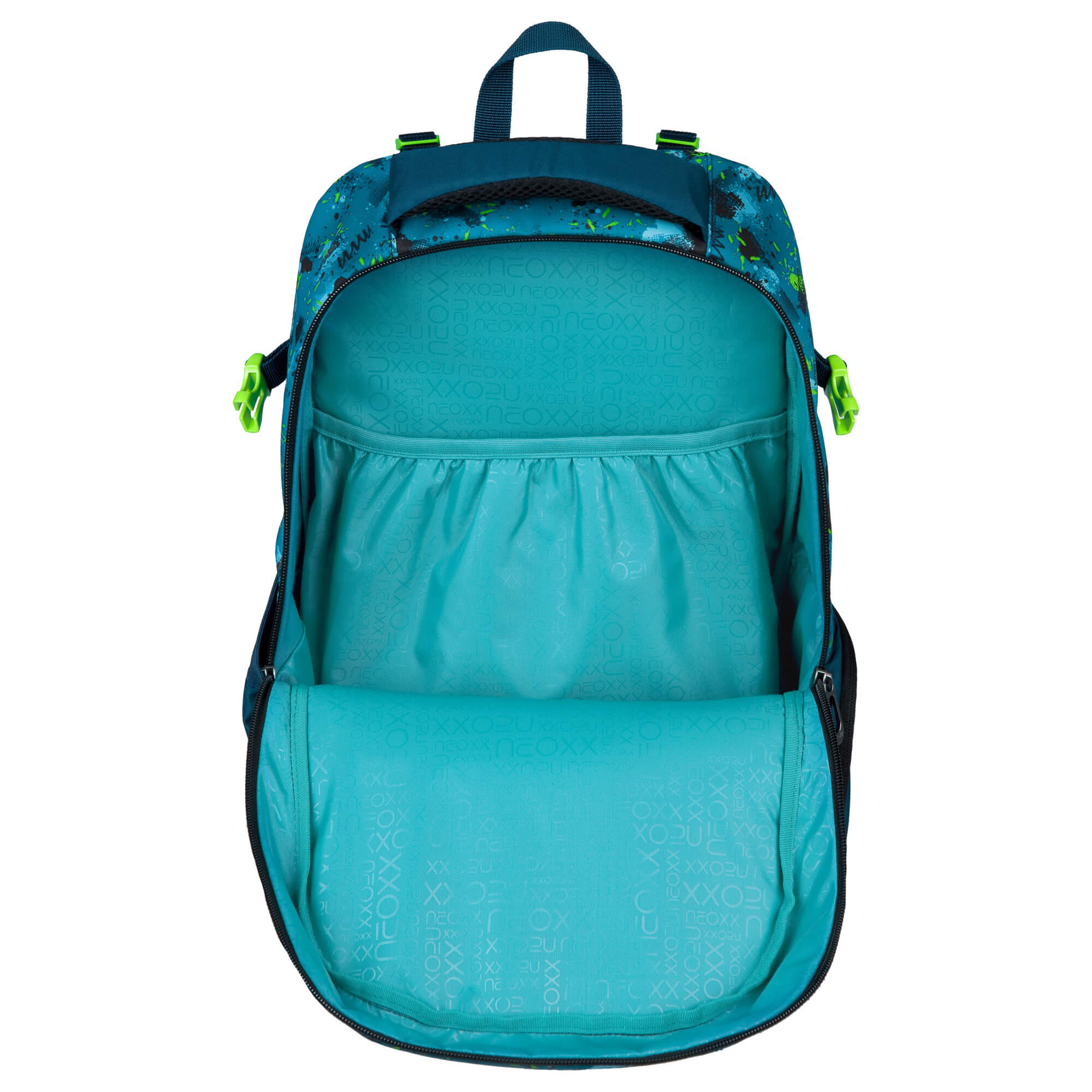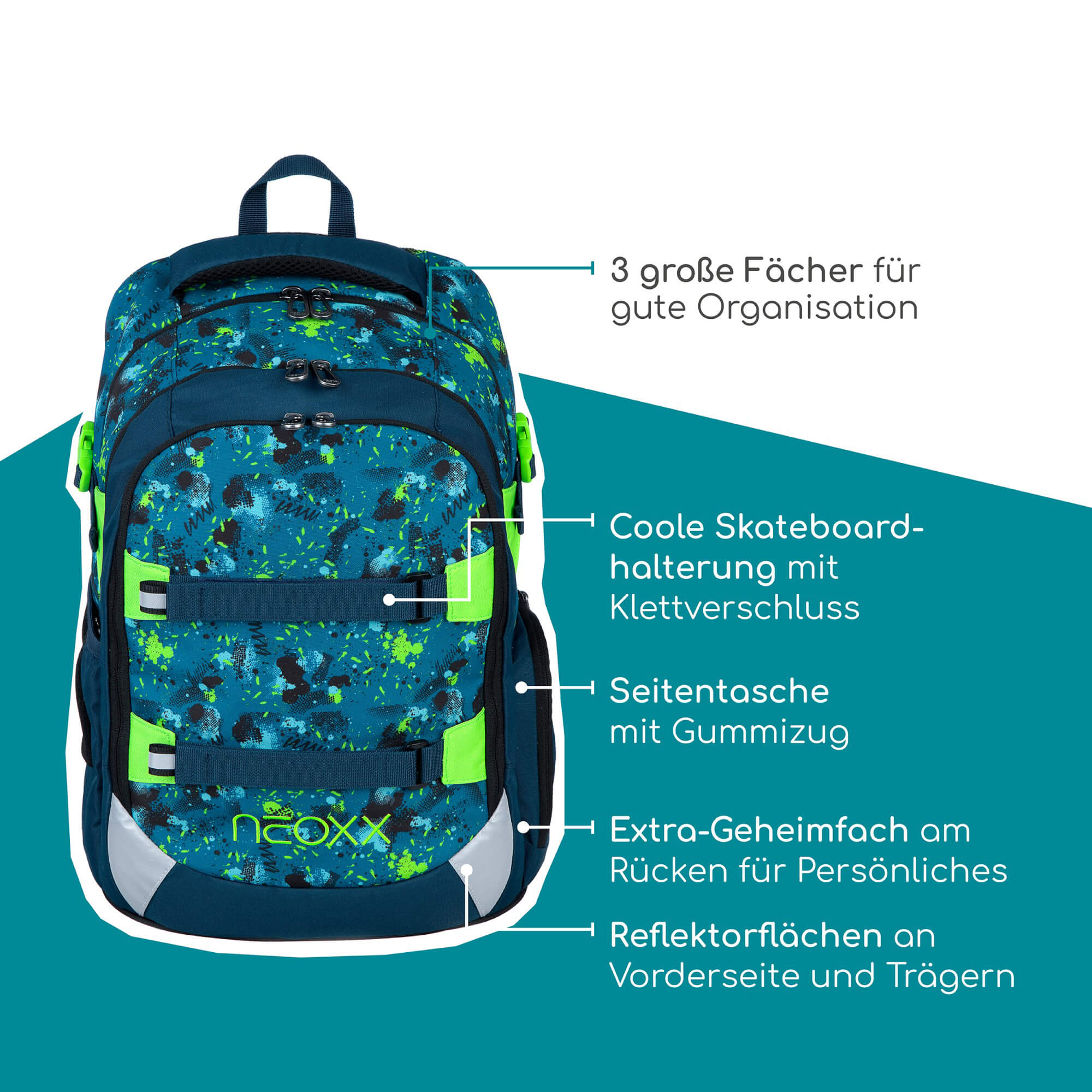 Descubra la mochila escolar Neoxx ACTIVE PRO en el color de moda Petrol extreme, diseñada especialmente para estudiantes a partir del 5º grado. Esta mochila combina un diseño estiloso con funcionalidad y sostenibilidad, ideal para la vida escolar.