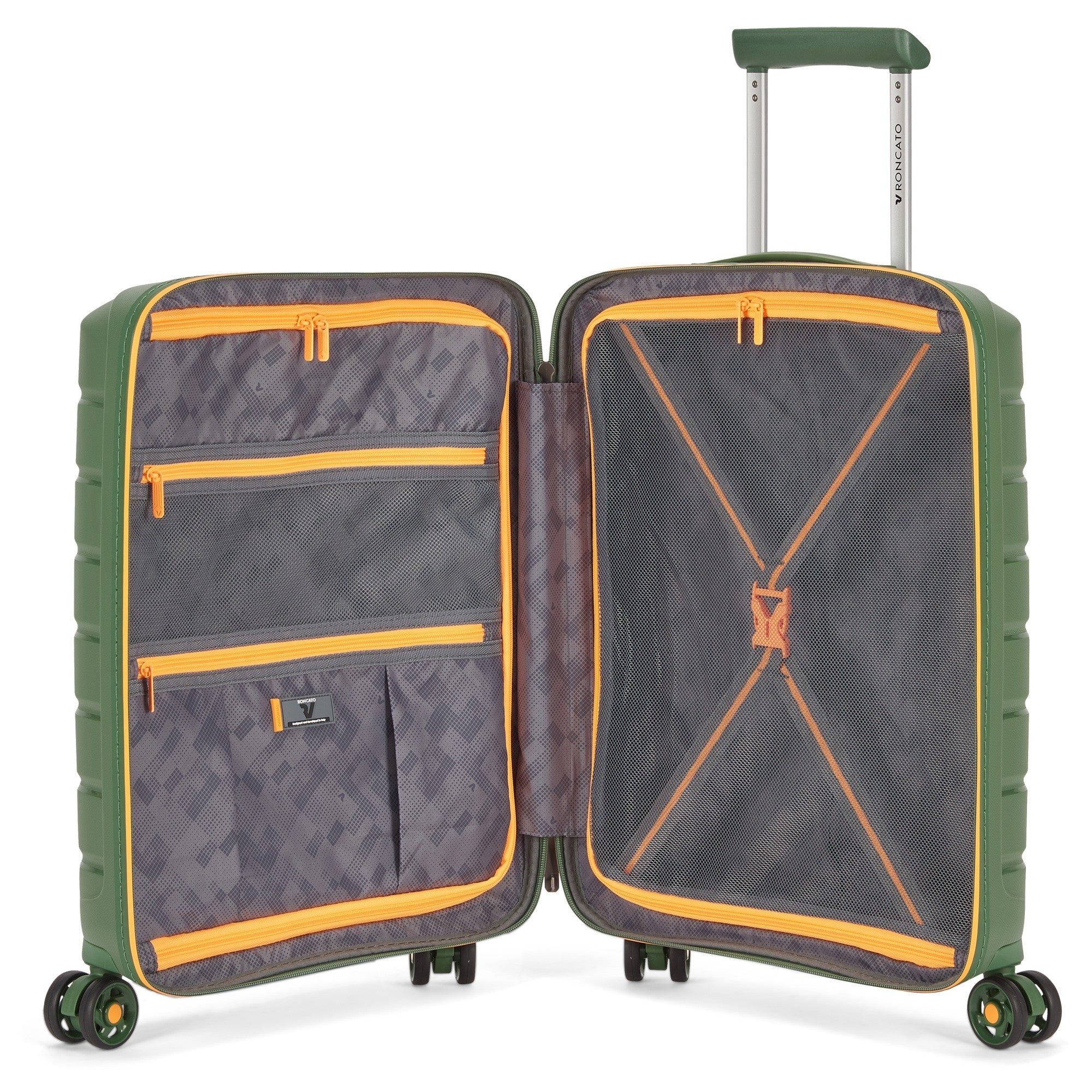 Entdecken Sie den Roncato B-Flying Neon 4-Rollen-Kabinentrolley in der stilvollen Farbe verde militare. Dieser Trolley wurde speziell für anspruchsvolle Reisende entwickelt, die auf der Suche nach einem leichten und robusten Gepäckstück sind. Die Kombination aus dezenten Farben und auffälligen neon-farbenen Reißverschlüssen sorgt dafür, dass Ihr Gepäck am Flughafen leicht zu erkennen ist.