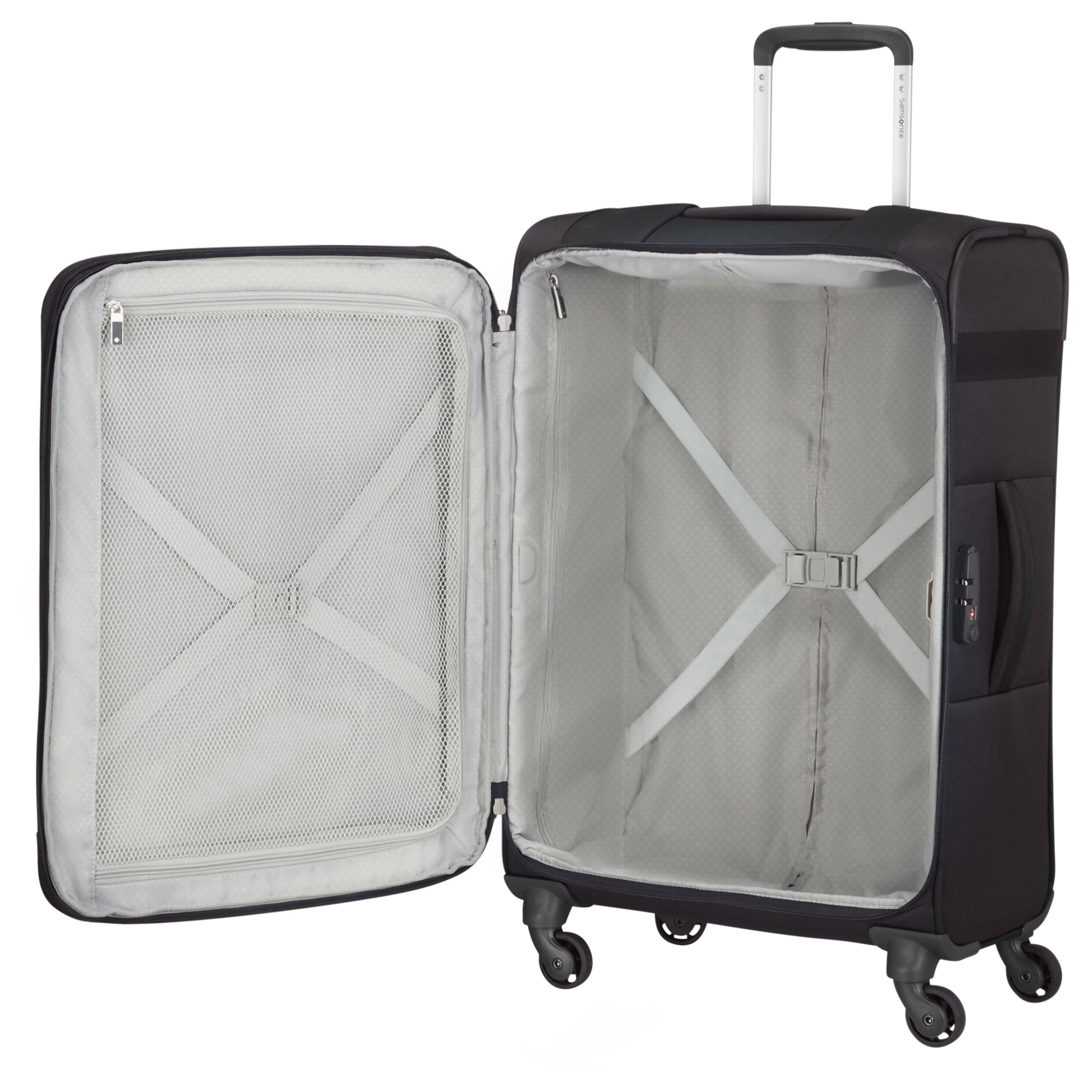 - Interior – con forro de poliéster estampado, un compartimento principal, bolsillo con cremallera y correas cruzadas para guardar sin arrugas