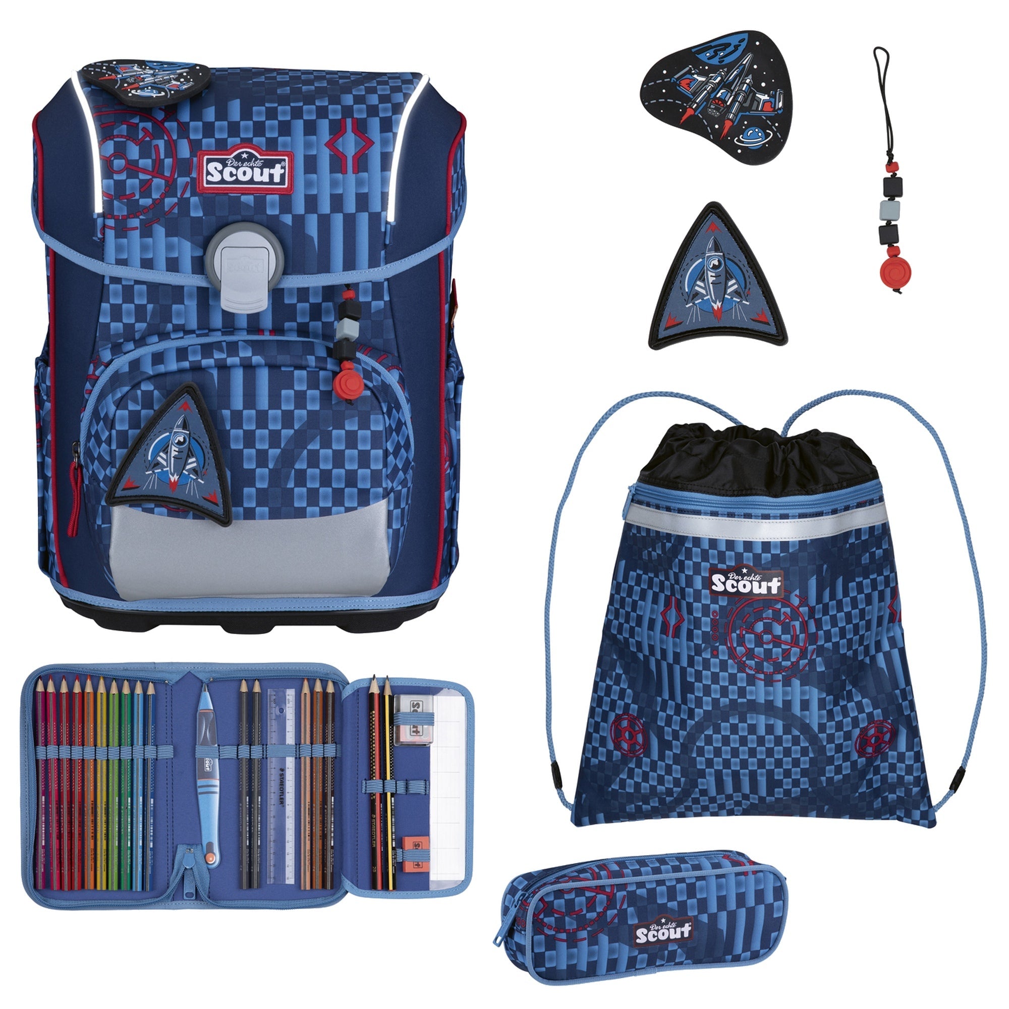 Scout Neo Exklusiv Safety Light - Set de mochila escolar de 5 piezas (Explorador Espacial)