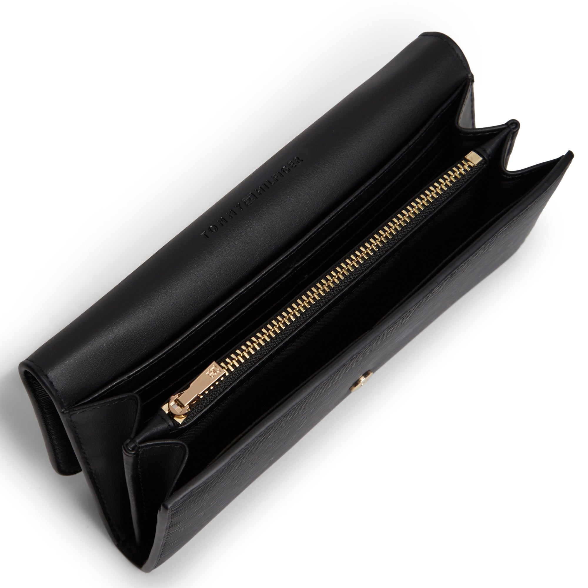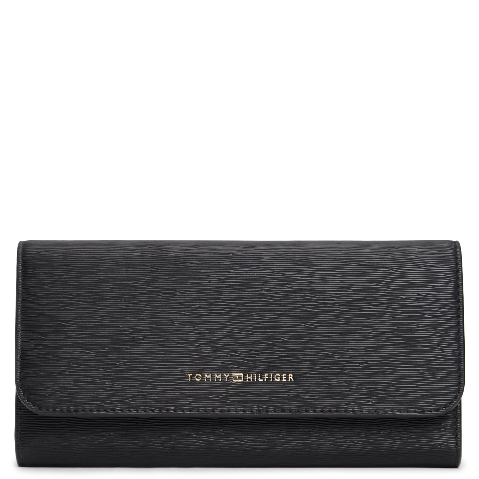 La cartera Tommy Hilfiger Modern L en clásico negro destaca por su acabado estructurado, que aporta una sensación de calidad a esta billetera compacta con solapa y cierre de botón a presión.